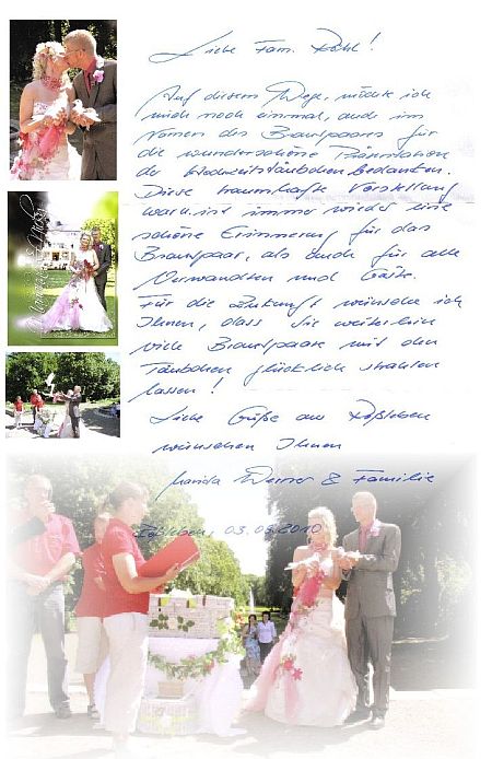 noch einmal herzlichen Dank an Sie auch im Namen des Brautpaares. Im Anhang sende ich Ihnen ein paar Fotos in kleiner Auflösung, die Sie gern für Ihre Internetseite verwenden können.