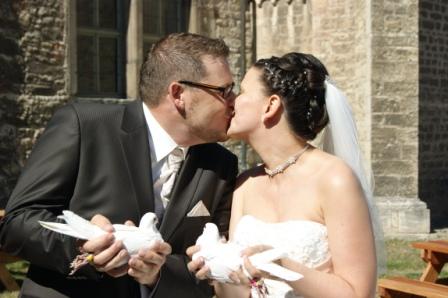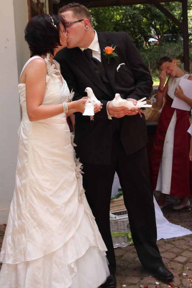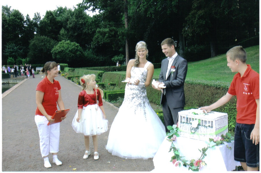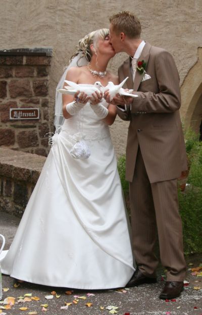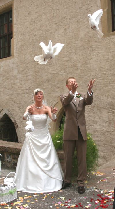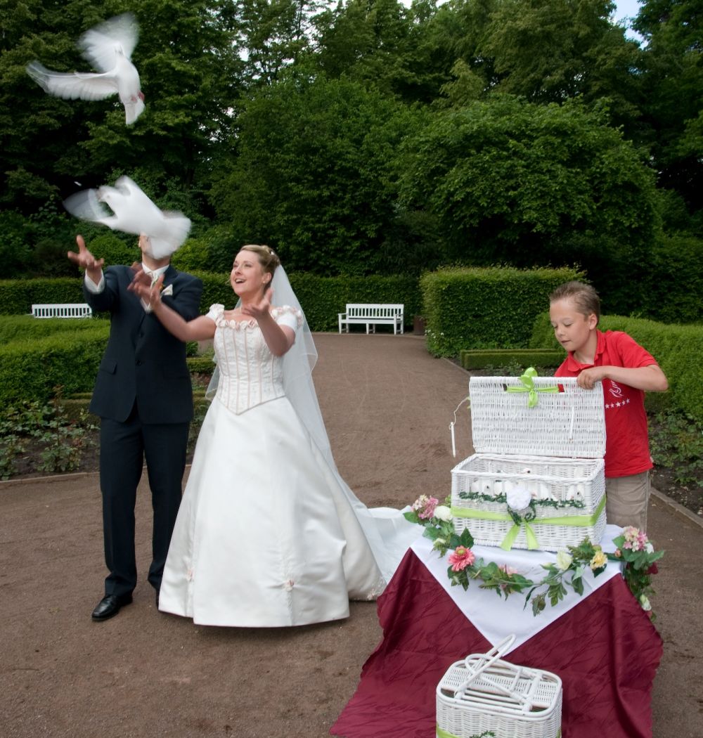 Hoffentlich haben alle Täubchen den Weg nach Hause gefunden. Unser frischvermähltes Paar hatte sichtlich Freude an der gelungenen Überrraschung. Die Täubchen werden sogar von beiden in ihrer ersten Danksagung an alle Verwandte und Freunde erwähnt. Wir wünschen Ihnen und Ihren schönen Tauben, dass Sie noch vielen Hochzeitspaaren und ihren Gästen soviel Freude wie uns bereiten können. Dafür sollte sich das Wetter dann von seiner guten Seite zeigen.