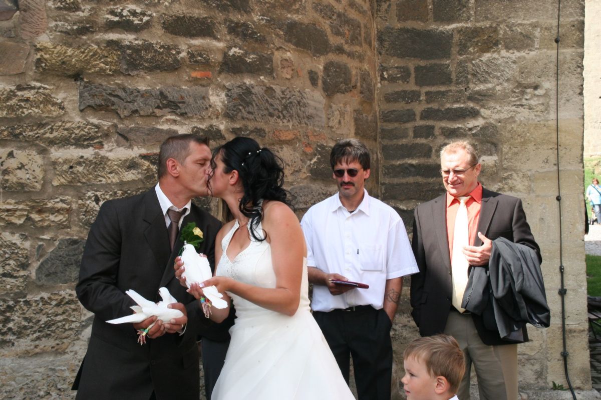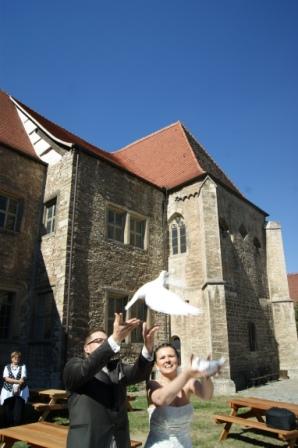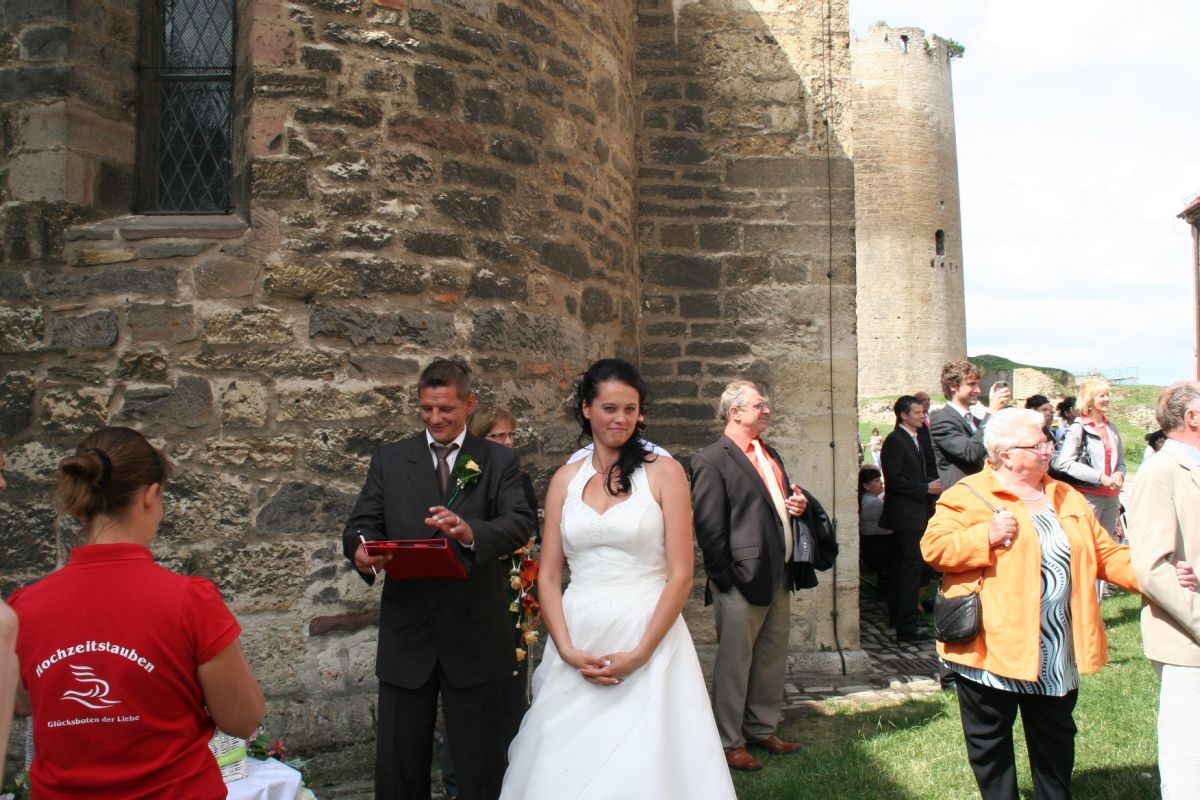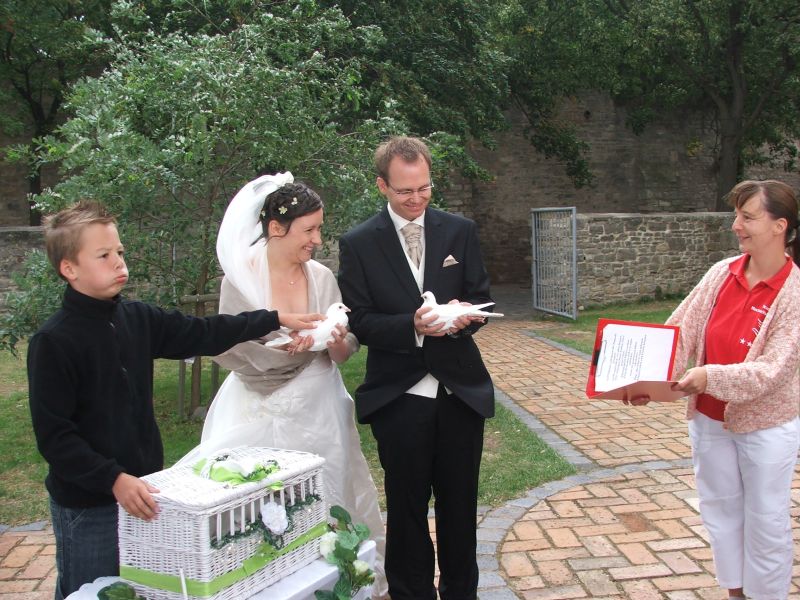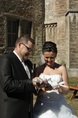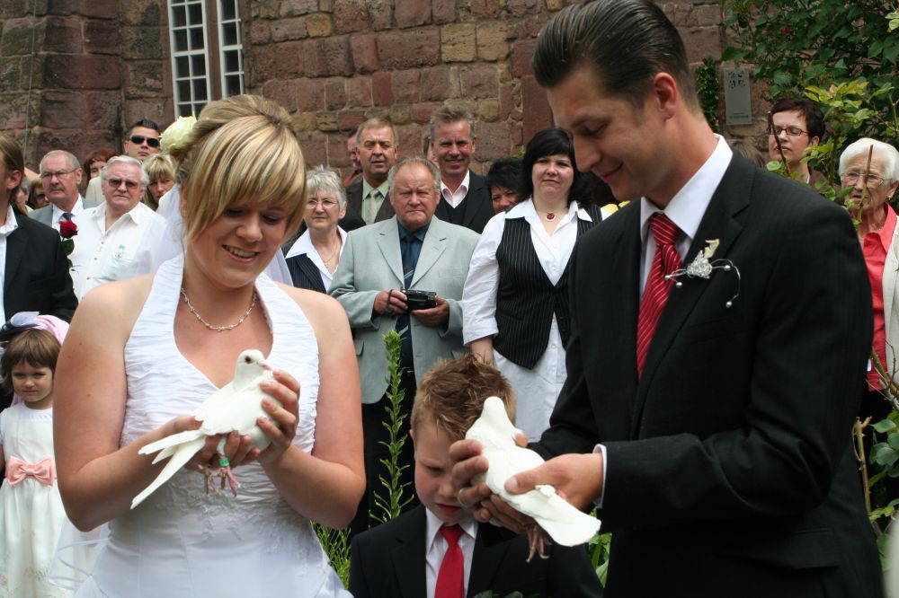 Hoffentlich haben alle Täubchen den Weg nach Hause gefunden. Unser frischvermähltes Paar hatte sichtlich Freude an der gelungenen Überrraschung. Die Täubchen werden sogar von beiden in ihrer ersten Danksagung an alle Verwandte und Freunde erwähnt. Wir wünschen Ihnen und Ihren schönen Tauben, dass Sie noch vielen Hochzeitspaaren und ihren Gästen soviel Freude wie uns bereiten können. Dafür sollte sich das Wetter dann von seiner guten Seite zeigen.