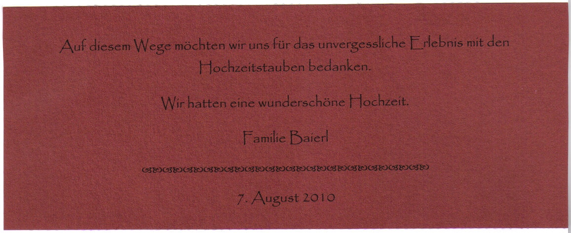 wir möchten uns herzlich für die wunderschöne Überraschung, die Sie dem Brautpaar zur Hochzeit mit Ihren Tauben bereitet haben, bedanken. Es war für alle Anwesenden ein unvergessliches Erlebnis.