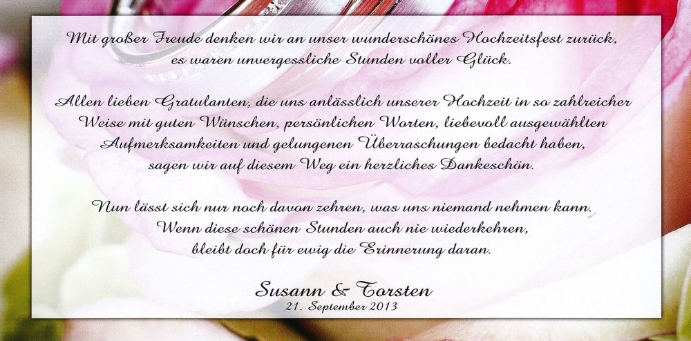 "...Liebe Frau Röhl, wir möchten uns auf diesem Weg ganz herzlich bei Ihnen bedanken. Sie haben unserer Hochzeitszeremonie den krönenden Punkt gegeben. Sie werden in unseren Erinnerungen an diesen Tag einen festen Platz haben. Vielen, vielen Dank. Es war wunderschön.
